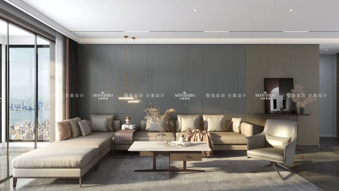 墻面的巖板中帶著絲絲縷縷的輕柔紋理,宛如細水清流,不會過于單調,也不會過分雜亂。木飾面、金屬、石材、棉麻等多變的材質襯托空間。地毯選擇材質比較厚重的灰麻色調,在寬敞的客廳中界定了相對柔和的區域,傳遞著隨性、沉穩而不失品質感的生活方式。